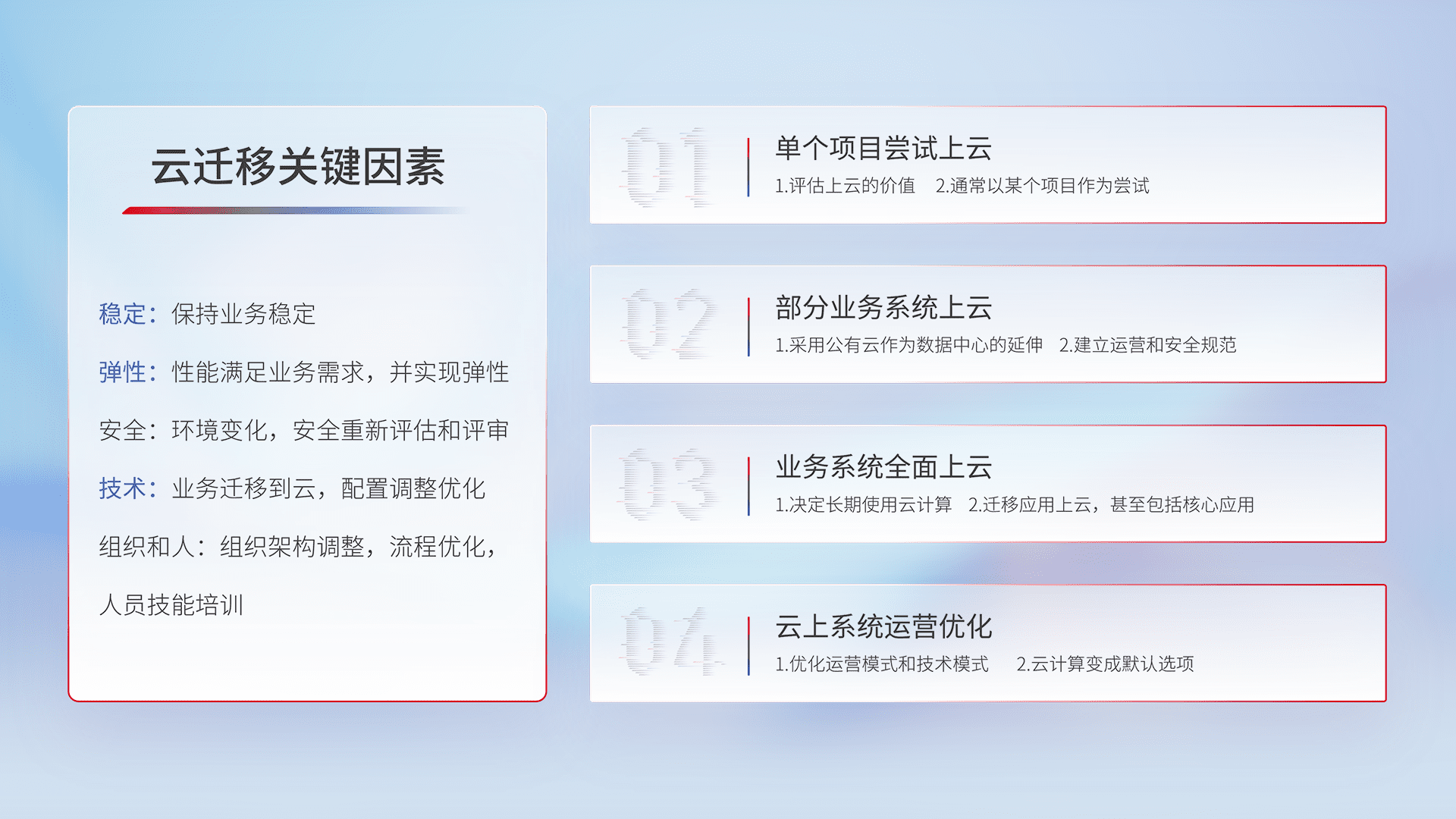 结合实际业务,,,,从规划设计、、、、云平台选型、、云原生改造、、、、数据迁移、、集成交付,,,迁移全过程为客户识别最佳上云路径,,,,做好风险识别管理,,设计网络架构、、身份权限、、、安全审计合规、、、操作审计、、、、日志审计、、监控告警策略、、、多站点容灾设计等,,,对云上基础设施进行整体规划,,,提升IT治理水平,,,以满足弹性、、、、高可用、、、、高性能的需求。。。。