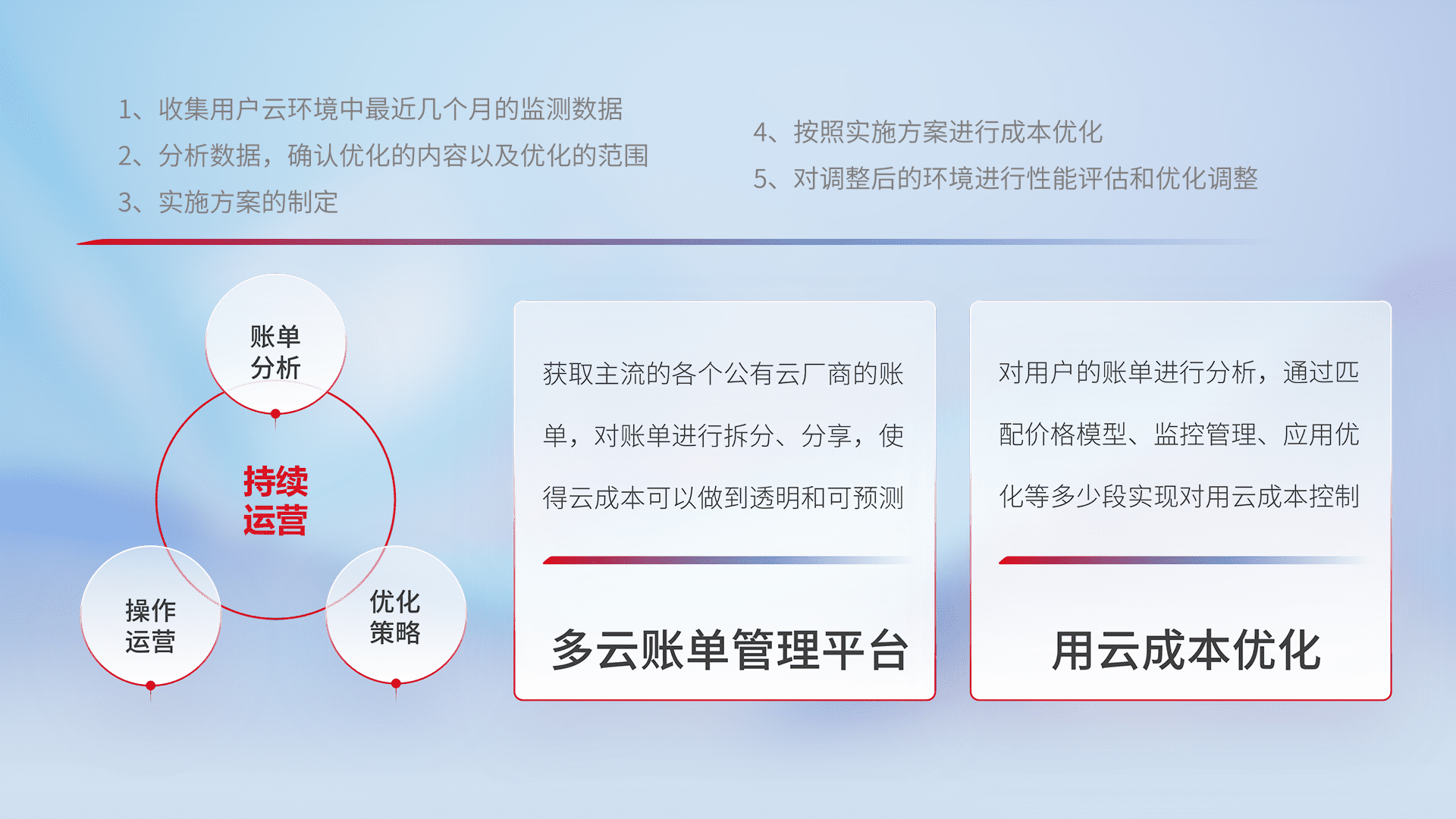 通过多云纳管,,,,以统一的资源数据模型把客户的云资源进行抽象和封装,,进而实现对多云资源的统一操作,,保障云资源管理的可靠性、、稳定性与可用性。。。。量身定制化运维内容,,配置、、、开发运维、、、补丁管理、、备份、、监控、、、认证和访问管理、、、、审计和日常巡检等,,,保障在用云过程中的可靠度,,,稳定度以及高可用率。。
